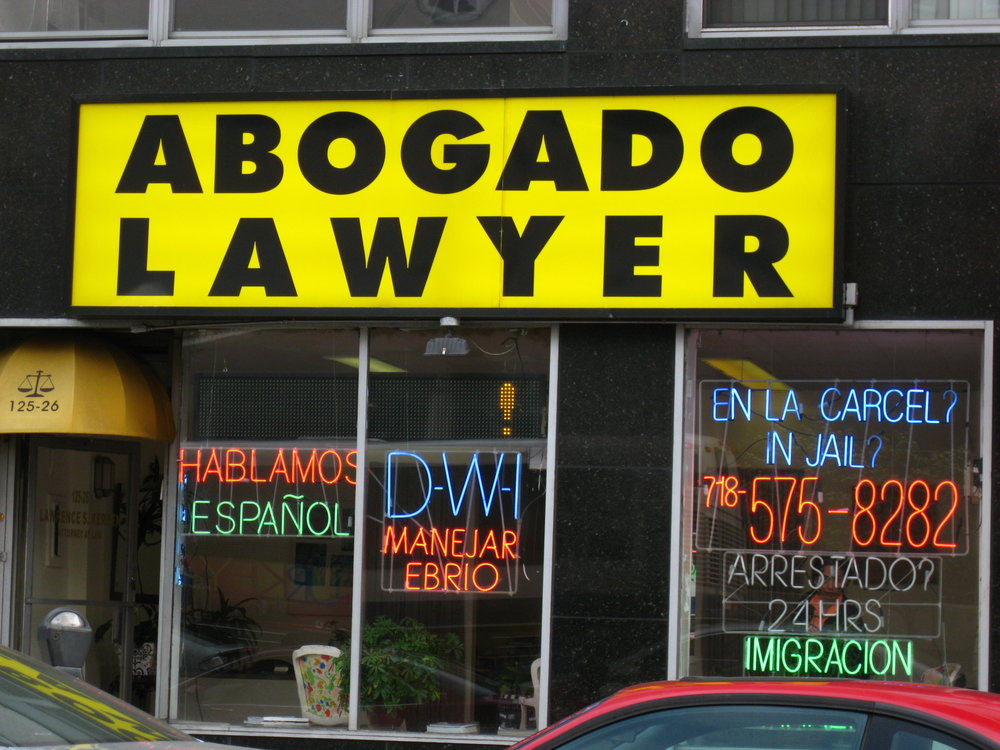 Parmi une infinité de détails possibles de la traversée de Brooklyn, cette vitrine criblée de néons colorés attire mon attention. Clic. Quand un cabinet d’avocats, me dis-je, présente le même genre de devanture qu’une épicerie de quartier ou qu’un sex-shop, ça sent le roussi pour les (présumés) délinquants en mal d’une défense efficace et appropriée. D’autre part, la position prééminente du mot « ABOGADO » au-dessus du mot « LAWYER » semble indiquer que le cabinet en question prétend s’adresser prioritairement à une « certaine clientèle », dont il n’est pas difficile de deviner, avec notre nouvel ami Ubu-Trump, que l’anglais n’est pas sa première langue, que pour l’Américain moyen elle doit se situer quelque part entre le mariachi, le clandestin et le dealer de came (les trois états n’étant pas incompatibles entre eux), et qu’à ce titre elle doit faire l’objet de toutes les suspicions, phénomène du reste entériné par l’ « abogado » lui-même, puisqu’il a choisi d’utiliser au premier abord pour son commerce, dans un pays censé parler l’anglais, la langue espagnole.